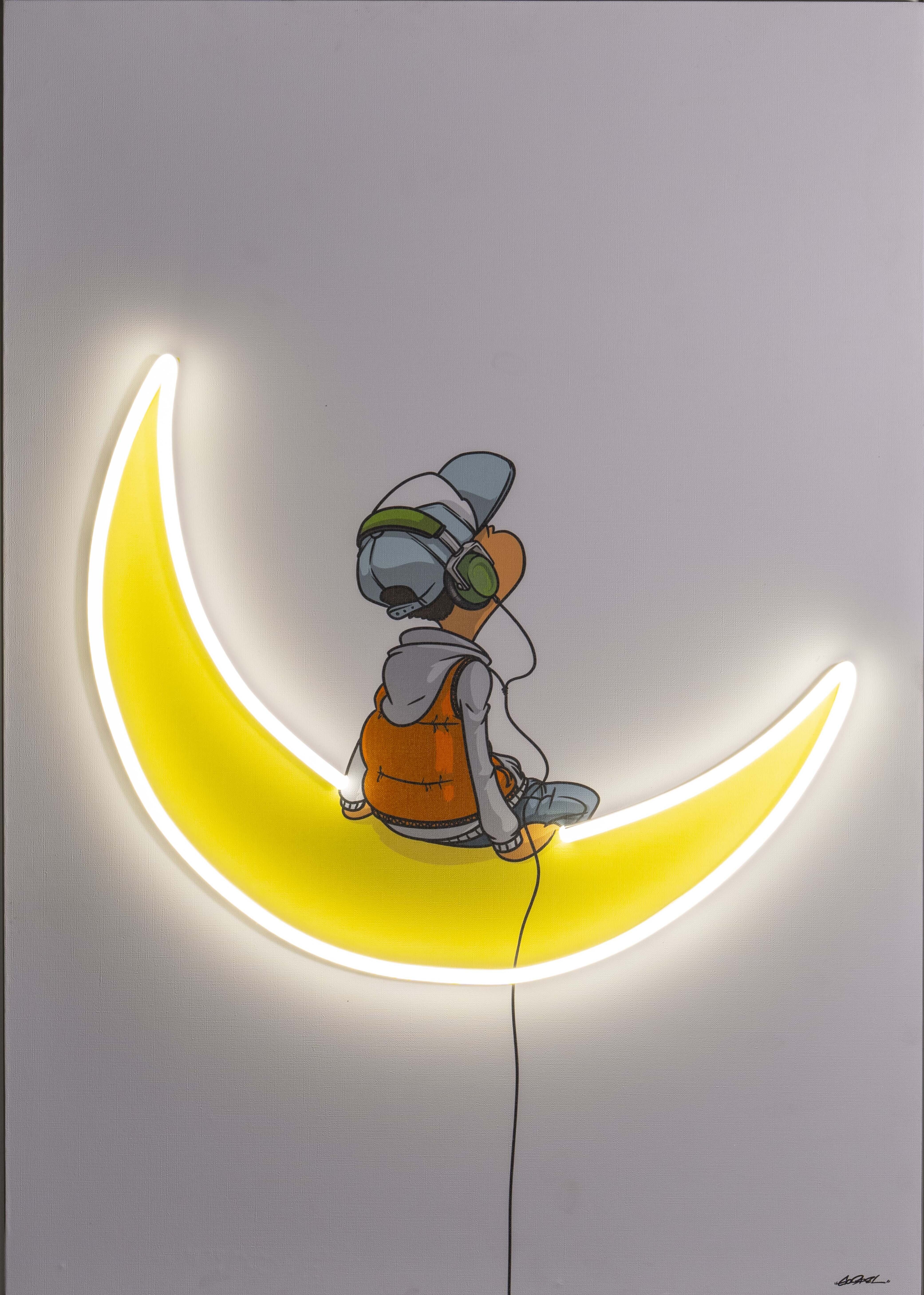 静かに灯る、月の光。 その上に腰掛け、音に身を委ねる小さな人物。 アーティスト Gospel とのコラボレーション作品「moon」。 やわらかなカーブを描く月のネオンと、物語性を感じさせるイラストレーション。 光そのものが“居場所”になる、詩的なネオンアートです。 サイズ:861mm x 614mm × 30 ネオンカラー:WHITE 額縁カラー : WHITE 日本国内家庭用電源コンセント100V 配線長さ:200cm~300cm *発送まで10-20日間程かかります。