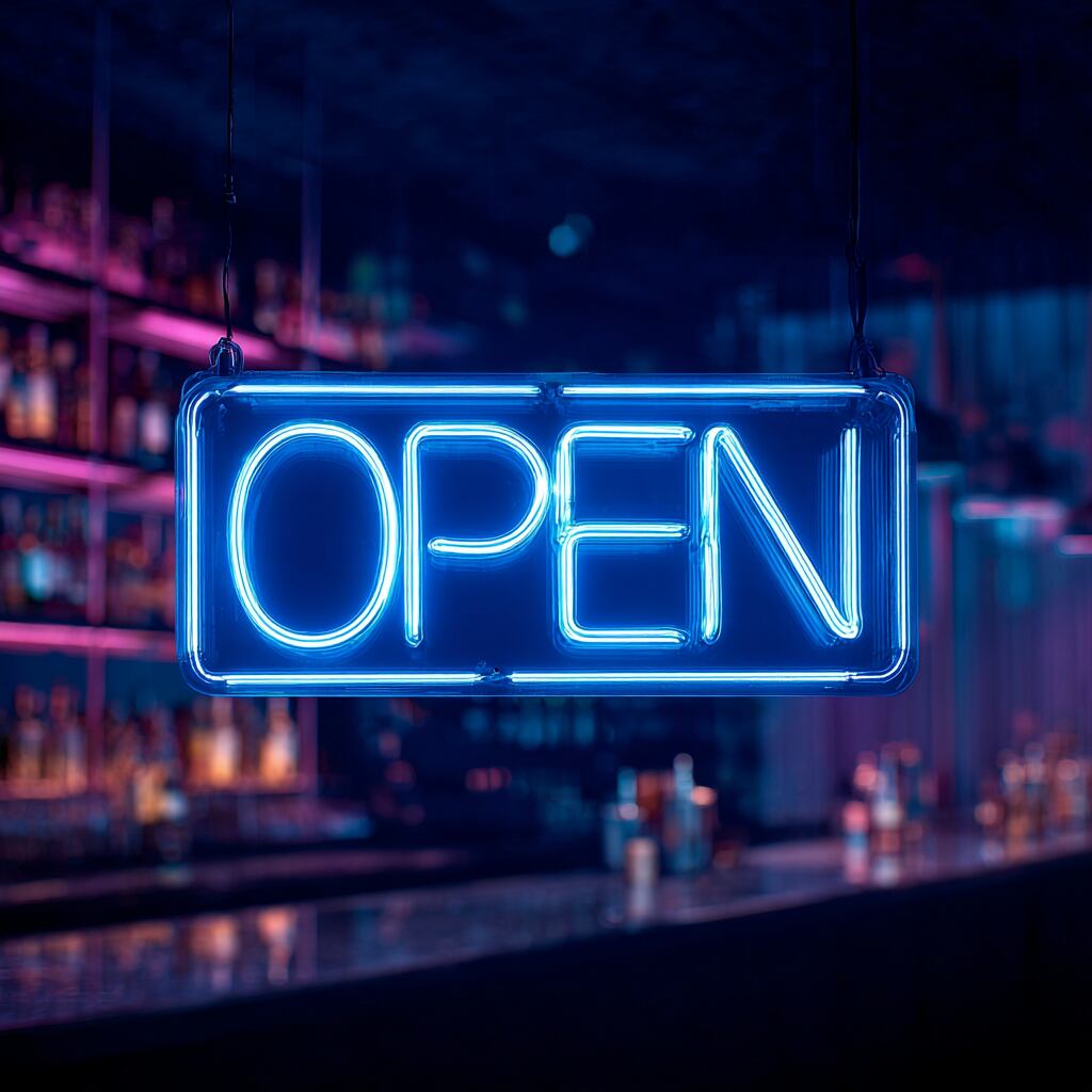 深みのあるブルーの光で「OPEN」を表現したLEDネオンサイネージ。