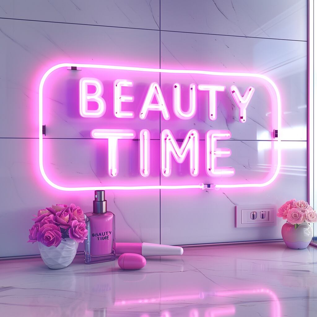 「BEAUTY TIME」の文字を柔らかなピンクの光で表現した、ビューティーサロン向けLEDネオンサイネージ。