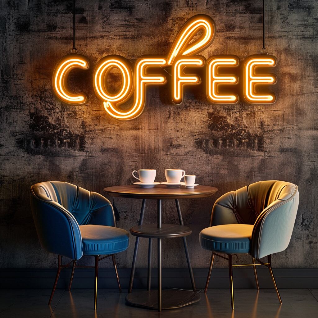 「coffee」の文字をやわらかなアンバーオレンジの光で表現した、カフェ向けLEDネオンサイネージ。