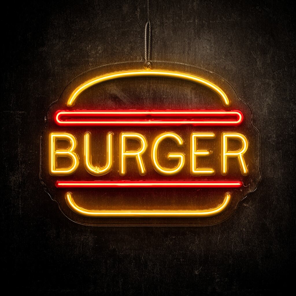 バーガーをモチーフにしたフレームに、「BURGER」の文字を組み合わせたLEDネオンサイネージ。