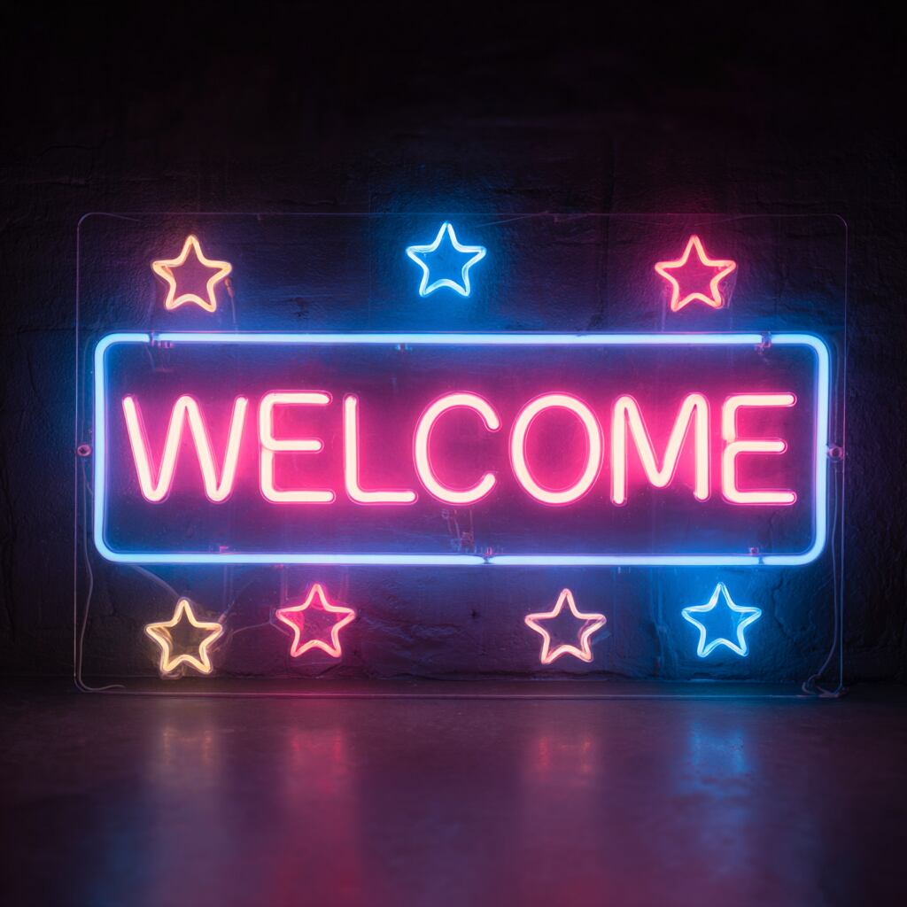 「WELCOME」の文字を中心に、星モチーフをあしらったLEDネオンサイネージ。