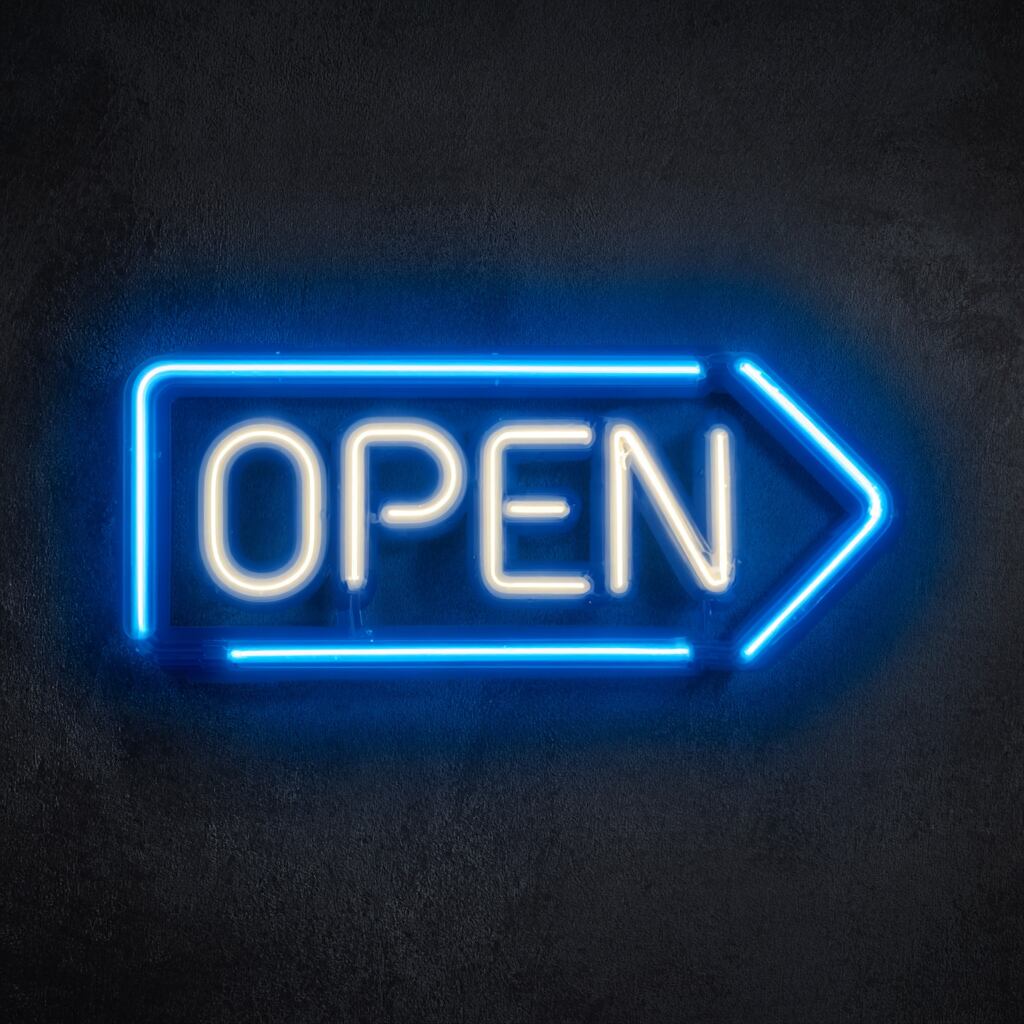 「OPEN」の文字と矢印を組み合わせた、視認性の高いLEDネオンサイン。
